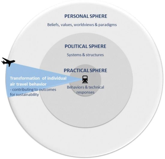 Figure 1. Three Spheres of Transformation, adopted from O’Brien and Sygna [9]. According to this framework, societal sustainability transformations in response to climate change take place across three interacting practical, political and personal spheres. “Transformation of individual air travel behavior” is added by the authors. Originally, the blue wedge illustrates “outcomes for sustainability” in general.