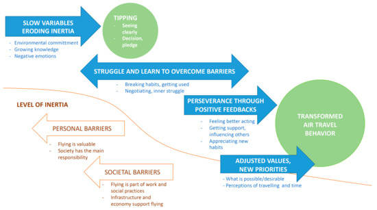 Figure 2. Phases and components of the transformation process. Blue arrows and green balls represent the different phases and components (themes emerging from the interviews) of the process of transforming air travel behavior, showing how this process typically plays out over time. Under each arrow, the consisting processes (subthemes) of each step theme are listed. Orange arrows show how the process is counteracted by various barriers.