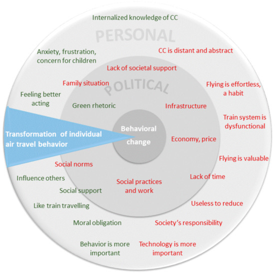 In this study, we use the spheres to investigate incentives (defined as factors driving the process of reducing flying) and barriers (defined as factors counteracting the change) to individual reduction of air travel. By mapping incentives and barriers in the personal and political spheres, we show how individual air travel behavior depends on beliefs, values, and worldviews (e.g., the perceptions of personal responsibility and emotions connected to climate change) as well as on political and social systems and structures (e.g., ticket prices and lack of alternative travel modes).