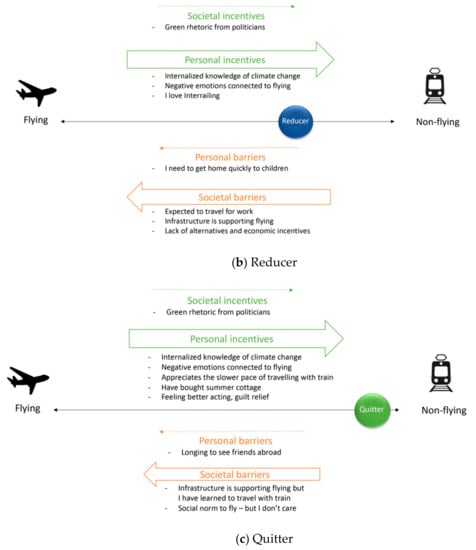 Our interviews provide a rich narrative of reducing flying as going against the grain, breaking norms and fighting structures and systems—while ultimately also providing positive experiences. Based on observations of the Facebook groups and by following the media discussion, we consider the quitters/reducers fairly representative for Swedes who quit or reduce flying for climate reasons. This is supported by the observation that the last interviews with quitters/reducers did not provide many new insights. We make no claims that the small sample of non-reducers is representative of Swedish travelers overall. Still, they provided useful insights about barriers and potential incentives for air travel reduction.