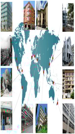 Since the present proposal aims to be suitable for assessing the seismic vulnerability of RC structures not designed for a specific country or location, it was calibrated with the data from 91 RC buildings spread throughout the world that were affected by earthquakes with different intensities. As depicted in Figure 2, data were used from Japan, China, Italy, Peru, Spain, Turkey, United States, Haiti, New Zealand, Indonesia, and Mexico. To perform the assessment and evaluation of these buildings, photographic and technical reports gathered and developed by academic and research institutions in the scope of reconnaissance and post-earthquake missions were used. In some of the cases, the information was complemented with other sources of information, such as plans, elevations and structural design drawings, material testing, as well as geotechnical information. As will be discussed further, in those cases, the confidence factor associated with the evaluation is naturally higher than in the remaining.