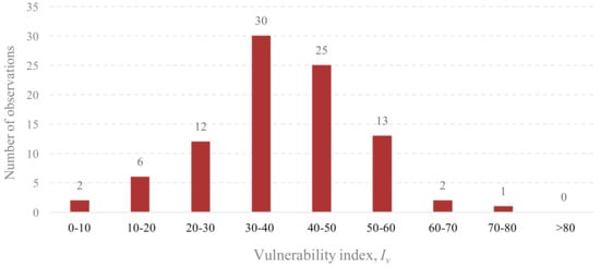 Distribution of the analyzed buildings over ranges of vulnerability index values.