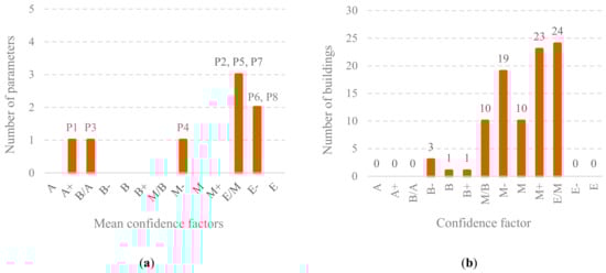 As can be seen in Figure 5a, the mean CF E/M is the one that has been used more often, having been assigned to parameters P2, P5, and P7 (position into the aggregate, irregularities in height, and short columns). The second confident factor with higher expression is the E-, with parameters P6 and P8 (soft-story mechanisms and other structural elements). Finally, due to the lack of information on the type of soil, parameter P1, which evaluates the building location, is the one that presents the lowest mean confidence factor (A+). Figure 5b presents the mean confidence factor associated with the building’s classification, i.e., corresponding to the average of the confidence factor attributed to each parameter assessed. The average confidence factor E/M is the one that has the most expression with 24 buildings (about 22% of the total sample), followed by the CF M+ with 23 buildings (about 21%). From this analysis, it is further possible to observe that there are five buildings with an average confidence factor lower than M/B. The average CF B- has three buildings (about 3%), whereas the average CFs B and B+ present one building each (about 1%).