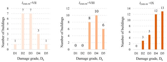 From the analysis of Figure 6, it can be noted that, for a seismic scenario with an intensity equal or higher than VIII, most of the buildings considered in this analysis present mean damage grades of Dk = 4 and Dk = 5, which means severe damage or collapse.