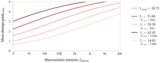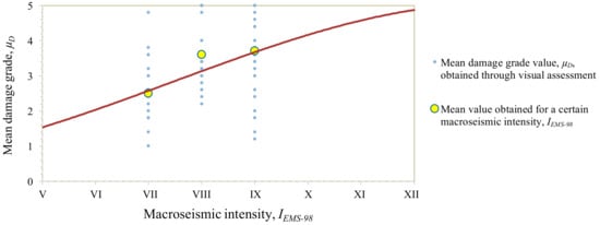 Figure 7 shows the comparison between the results obtained and the analytical expressions given by Equation (5), considering the Iv,mean = 38.73 and the own damage grade observed for each one of these buildings. Additionally, three yellow dots, representing the mean values obtained from the Iv for each intensity, were also included.