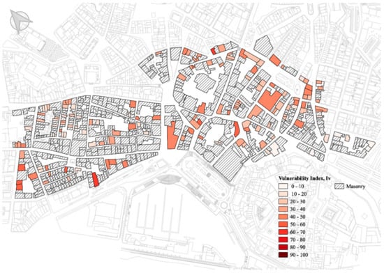 The presented methodology was applied to the 166 identified buildings through visual inspections and access to building data. The application resulted in an average vulnerability index, Iv, of 29.36. The associated standard deviation, σIv, is approximately 13.40. About 77% of the assessed buildings present a vulnerability index of less than 40, and only 5% of the buildings have an index greater than 50. The maximum and minimum vulnerability index obtained is 66.30 and 3.33, respectively. Figure 9 shows the spatial distribution of vulnerability indices of the RC buildings evaluated. Through the color scale, it is possible to notice that most buildings have a relatively low vulnerability index. The higher vulnerability index value is associated with a building with four upper floors of residential use, and a commercial area at the ground floor level. Besides, it has a difference of heights between floors and a rooftop indentation. Due to these most penalizing factors, the vulnerability index results in the highest value between the assessed buildings. The lowest determined vulnerability index is 3.33 and corresponds to a building only with two floors, with no commercial area on the ground floor and no irregularities, which leads to a low vulnerability index value.