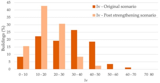 The change introduced in the vulnerability class of parameter P6 naturally leads to a reduction in the vulnerability index. Thus, an average Iv of 19.18 and a standard deviation, σIv, of 8.94 was obtained, i.e., Iv and σIv have a decrease of approximately 35% and 33%, respectively, from the initial value. Figure 10 shows the histogram of the distribution of values of vulnerability indices, pre- and post-strengthening. This comparison shows that the vulnerability index decreased significantly. In fact, with the strengthening, about 98% of buildings have a vulnerability class lower than 40, while only 2% have an Iv between 40 and 50. The maximum and minimum vulnerability index is 49.6 and 3.33, respectively.