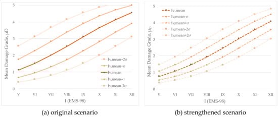 After obtaining the new vulnerability indices for each building, the associated mean damage grades were re-estimated using the procedure presented earlier in Section 2.3. Figure 11 shows the vulnerability curves referring to the original and the strengthened scenarios, plotted for the characteristic values of the vulnerability index distributions: Iv,mean, Iv,mean + σIv, Iv,mean - σIv, Iv,mean + 2σIv, and Iv,mean − 2σIv.