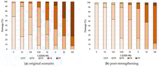 Furthermore, Figure 12 presents the damage grade distribution, pre- and post-strengthening, for different macroseismic intensities. As expected, after strengthening the most vulnerable structures, the overall level of damage decreases. Such a decrease is particularly expressive for the macroseismic intensity XII. In this case, the percentage of buildings with a damage grade D5 is much lower than the initial values, which means that the number of collapsing buildings has decreased significantly (from more than 70% of collapsed buildings to less than 10%).