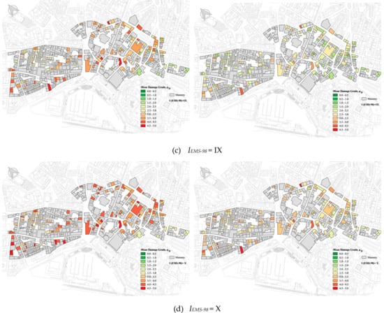 Figure 13 shows the damage scenarios for seismic events characterized by macroseismic intensities, IEMS-98, between VII and X. From the observation of the figures, it is possible to observe a significant difference in the color scale for the same macroseismic intensity after application of the seismic strengthening action.