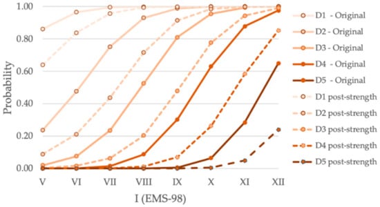 Figure 14 shows the fragility curves corresponding respectively to the original and the strengthened scenario. As can be seen from Figure 14 and as expected, after strengthening the critical buildings, the probability of exceeding the degree of damage decreases noticeably. By way of example, the probability of exceeding the degree of damage D3 for an earthquake of intensity VIII decreased by about 30%.
