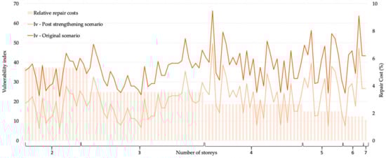 To observe its reduction after the intervention, the vulnerability index of the 101 buildings strengthened is also presented. In order to facilitate analysis, the buildings are organized by the number of floors. Figure 15 shows that the relative cost varies between 1.5% and 5.3%. Since the intervention was planned to be implemented only in the ground-stories, as expected, the taller buildings present lower relative cost when compared with the smaller ones. Thus, the relationship between the total cost of reinforcement and the total value of construction has higher values in buildings with fewer floors. In buildings with 6 or 7 floors, the relative cost is less than 2% of the construction value.