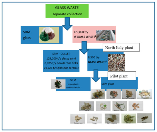 The selection and treatment of the glass was completed in treatment plants where the waste was processed into the cullet (according to the US EPA [2] 2012 definition, this is glass that is crushed and ready to be re-melted), a secondary raw material (SRM) suitable for glass factories [3,4,5,6]. In particular, once the glass waste reaches the treatment plant, it is subjected mainly to the following treatments: manual sorting for elimination of foreign bodies, magnetic separation of ferrous metals, separation of non-ferrous metals by means of eddy currents, crushing by means of a roller mill, size classification with a vibrating screen, separation of light materials by means of cyclon and separation of glass into different colors using an optical sorter [7,8,9,10].