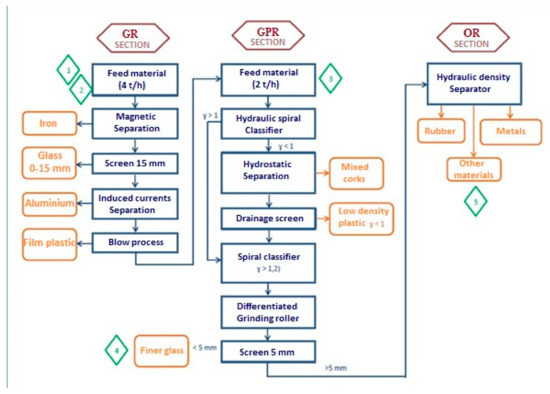 Plant operation for the recovery of glass waste3: brown indicates the main section of the plant.