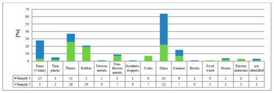 In Figure 4, the results of classification by waste type of Samples 1 and 5 are shown. As can be noted, the percentage of glass decreased from 42% to 22%. Moreover, in Sample 5 (which represents the real waste of the plant at the present), there is a considerable amount (of about 20%) of plastic and rubber.