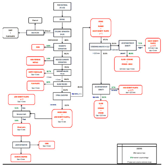 Figure 6 shows the flow sheet of the processing treatment suggested for the new plant and the weight percentage estimated for the material separated. The main processing difference can be found from the products of the separation of the spiral classifier. Mixed corks and plastic such as PP (polipropilene), HDPE (high density polyethylene) and LDPE (low density polyethylene) (density less than one) will be separated by the new technology, named as the bath extractor. A further laser separation can be used for the separation of cork from synthetic stoppers. Concerning the mix of stone, rubber and plastic with a density higher than one (PVC, polivinyl chloride and PET, polyethylene terephthalate), representing the second product of the spiral classifier, jig separation on the two different products obtained will be performed after a screening separation at 12.5 mm.