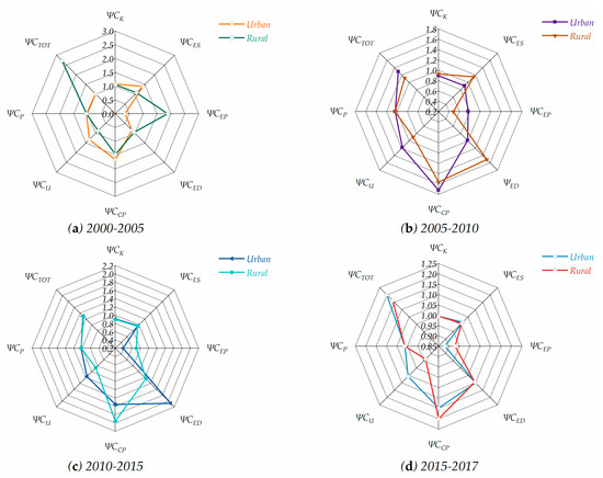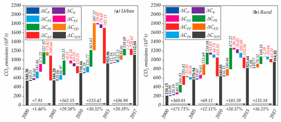 The energy price effect played the most important role in reducing the residential energy-related CO2 emissions in both urban and rural regions. In addition, the carbon emission coefficient had a minor effect on decreasing urban and rural residential energy-related CO2 emissions. The results showed that urbanization exerted a positive effect on increasing the urban residential energy-related CO2 emissions, but decreasing the rural residential energy-related CO2 emissions. Consumption expenditure-per-capita effect was the most important factor increasing the residential energy-related CO2 emissions in both urban and rural regions, followed by energy demand. From 2000–2017, population effect and energy structure played a minor role in increasing the urban and rural residential energy-related CO2 emissions.