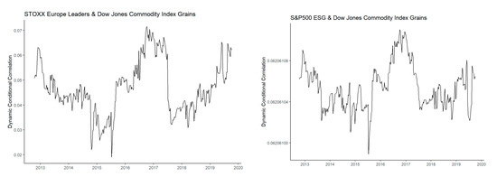 There is very little research on the volatility dynamics of socially responsible investments and correlations between the stock prices of socially responsible companies and commodities like grain, precious metals, and industrial metals. Sadorsky [34] investigated volatility and correlations between DJSI, S&P 500, and two commodities: gold and oil. His findings indicate, from a risk management perspective, that SRI offers very similar results in terms of dynamic correlations, hedge ratios, and optimal portfolio weights as investing in the S&P 500.
