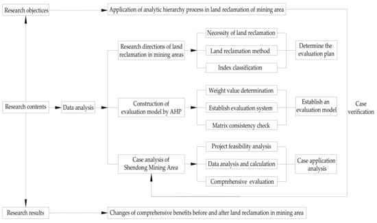Sustainable development is the ultimate goal of mine production. The sustainable development of reclaimed land in mining areas implies the process of land reuse based on land reclamation and ecological reconstruction []. The key to the sustainable development of mining areas lies in the coordination with social, ecological, and economic benefits. This study examined the sustainable development of the mining area in terms of changes in comprehensive benefits before and after land reclamation. Figure 1 shows the technical route.