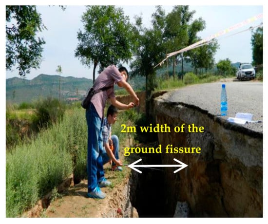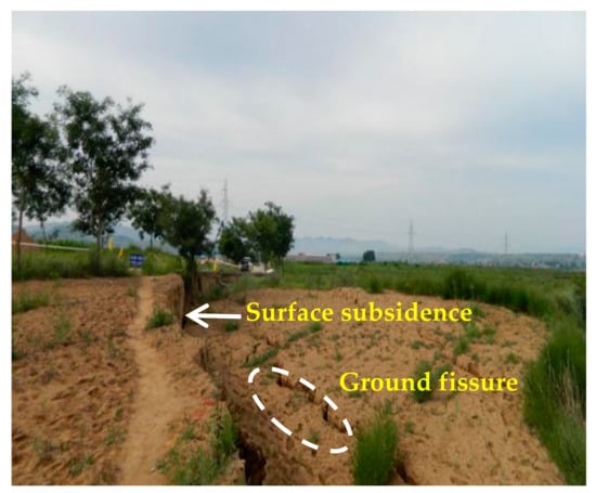 Mine subsidence occurs because of the collapse of underground mineral resources and generally manifests as collapse pits, ground fissures, and landslides. The large-scale mining of mineral resources in Shendong mining area has not only destroyed the natural and human environment of the original land, but also caused the loss of surface water and soil, rendering the resulting surface barren and prone to desertification. Moreover, the large-scale mining minerals caused landslides, earthquakes, and other geological disasters. For example, in the Hanjiawan Mine of Shendong mining area, serious surface deformation has been caused by mining, resulting in surface cracks as wide as 2 m and as deep as 15–20 m, as shown in Figure 3.