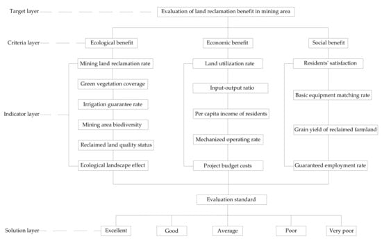The research objective was to evaluate land reclamation benefits by analyzing the land reclamation quality, ecological landscape effects, agricultural land area, and resident income level in the study region [,]. We used an analytical hierarchy process to comprehensively evaluate the land reclamation benefit of the mining area. Based on different evaluation index attributes, the land reclamation evaluation was divided into four layers (Target layer, Criteria layer, Indicator layer, and Solution layer), to establish a comprehensive benefit evaluation model, as shown in Figure 6.