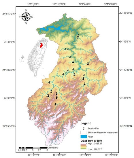 The specification and installation of the erosion pins were described in Lin et al. [12]. Within the boundary of the Shihmen reservoir watershed, a total of 550 pins were installed on 55 slopes (10 pins per slope). The measurement data were collected from 8 September 2008 to 10 October 2011. The annual erosion depths were averaged at each slope, and the value ranges from 2.17 to 13.03 mm/yr. The metal rods (pins) used in this analysis were mounted on slopes without any signs of a landslide, collapse, or gully erosion. Therefore, our findings cannot be generalized beyond sheet and rill erosion.