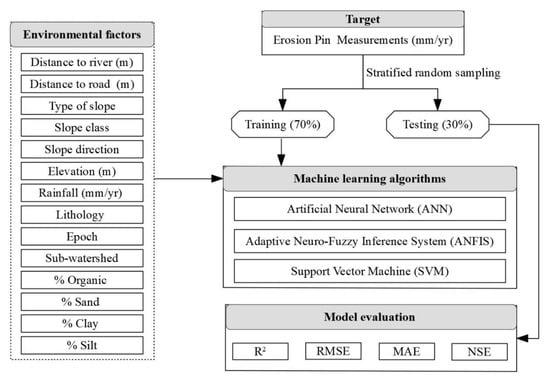 In this study, ML algorithms were used to predict the erosion rates of sheet erosion and rill erosion. The overall framework of the study consisted of three main parts (Figure 2), as summarized below.