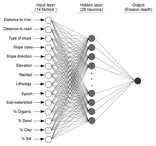 An Artificial Neural Network (ANN) mimics how the human brain processes information. The purpose of the ANN model is to predict a target outcome by using input data through a back-propagation learning algorithm [34]. A typical ANN model has a multi-layer feed-forward structure that is connected by nodes with three main layers, namely the input layer, the hidden layer(s), and the output layer. The ANN determines the weight for each node and builds its results through training. In this study, the ANN model was created using the ‘nntool’ in the MATLAB 2016 software. A three layers feed-forward back-propagation network type was used. It consists of an input layer (14 neurons representing 14 environmental factors), one hidden layer (29 neurons), and one output layer (erosion rate), as shown in Figure 3. The number of neurons of the hidden layer is determined based on the following equation [35]: