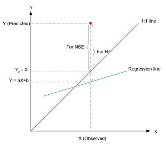 It is worth noting that although R2 has been widely used for model evaluation, the statistics are highly sensitive to extreme values and are insensitive to additive and proportional differences between model and measured data [40]. More importantly, R2 is calculated against the regression line (Figure 4), not the 1:1 line. A high R2 only means a good fit to the regression line, not necessarily a set of good predictions concerning the observations (see the distinction made between the regression line and the 1:1 line in Figure 4). Therefore, we retain R2 in this study only for completeness. Instead of relying on R2, we computed RMSE, MAE, and NSE to compare the model performance. They are more appropriate than R2.