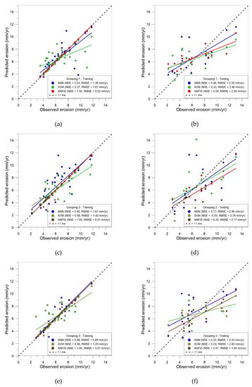 Figure 5. X-Y plots of predicted values vs. observed values: (a) Grouping #1—Training data; (b) Grouping #1—Test data; (c) Grouping #2—Training data; (d) Grouping #2—Test data; (e) Grouping #3—Training data; (f) Grouping #3—Test data.