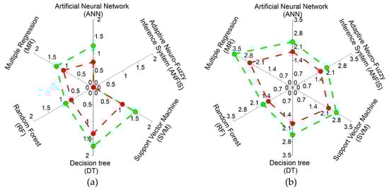 Figure 6. Radar plots of six ML models: (a) Training data; (b) Test data.