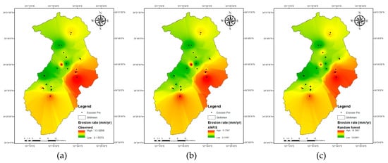 Figure 7 shows the interpolated distribution of erosion rates (mm/yr) in the study watershed using the Inverse Distance Weighting (IDW) method. Figure 7a was obtained from erosion pin measurements, whereas Figure 7b,c were predicted by ANFIS and RF, respectively. It can be seen from the figures that the same distribution pattern is observed. The erosion rate is the highest on the east side of the study area, the lowest on the west side, and the north and south sides have an in-between erosion rate.