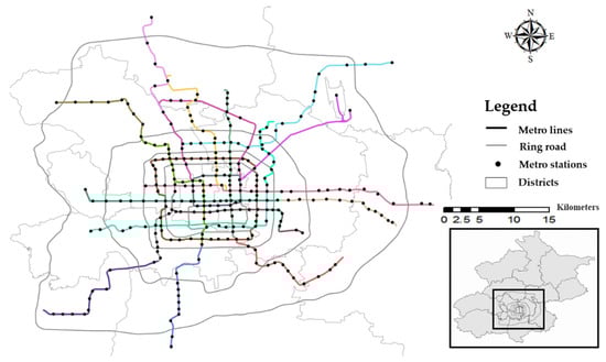 The case-study context of this study is Beijing, China, which contains 16 urban districts and 152 Jiedaos [49]. Jiedao is an administrative unit in China that covers an area about 10 km2. The city features a total area of 16,410 km2 and 21.70 million citizens. Beijing has six ring roads, the area within the Fourth Ring Road is generally defined as the urban area, and the area outside the Fourth Ring Road is the suburban area [32]. By the end of 2016, 15 metro lines were running in Beijing, covering 275 metro stations (recording the transfer stations of different metro lines as one, Figure 1). Meanwhile, All DBS companies continually launched 2.10 million bicycles in Beijing, and Mobike occupied half of the bike share market [50]. Meanwhile, Beijing has nearly 67,000 taxis.