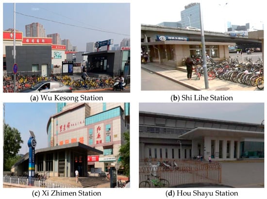 The metro station characteristics, including the location, the number of entrances, and so on, are collected from the website of Beijing Subway (https://www.bjsubway.com). Note that at almost all stations, passengers can be dropped off at the roadside nearby the entrances, and they can be picked up either at roadside, or at a designated taxi waiting area nearby; while for the DBS users, they can easily pick up or drop off bicycles at the sidewalks or bicycle parking areas nearby the entrances. Despite of various public space design at different metro stations, examples are shown in Figure 2a–d, the convenience of using taxis or DBS seems not be significantly affected by the public space design, so the characteristics of public space design is not collected in the study.