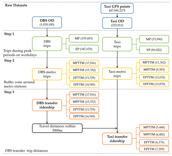 Because metro transfer behaviors usually occur to commute during peak periods, we select DBS and taxi transfer trips during peak periods from the dataset. There are some errors and redundant information exist in the raw data, so we ran a series of processing steps described below, and the final sample size of the dataset after filtering by each step is shown in Figure 3.