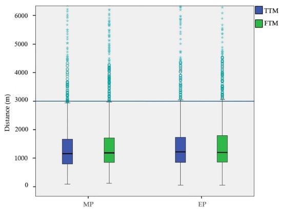 Figure 4 shows the trip distances of DBS for metro access during peak periods. Trip distances of TTM and FTM do not show significant differences. The median trip distances of all are about 1,200 m, which are consistent with the previous study. Reportedly, people travel 1,200 m or more when using bicycles to access transit [55]. Additionally, All higher boundaries of trip distances are approximately 3,000 m, which mostly concurs with the prior study that the majority of bicycle trips connecting metro stations and homes or workplaces are between 1,000 m and 4,000 m [32]. Therefore, the transfer distance is set as 3,000 m. Also, we will take 3,000 m as the radius of the buffer zones each metro station to measure the built environment variables. Then, we calculate the trip distances of taxi by the GPS trajectories and screen out the trips with travel distance within 3,000 m as metro-taxi transfer ridership. Because we want to analyze those metro-taxi connections that compete with DBS.
