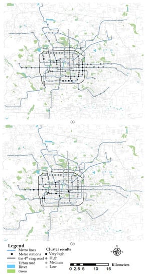 To summarize the DBS and taxi transfer ridership around the metro station and obtain a clear view of the demand level of two modes during peak periods, four indicators, namely, TTM/FTM ridership of DBS and taxis at MP/EP are used to cluster. K-means method is a cluster algorithm by iterative solution, which can be useful for analyzing not only the big data of bicycle sharing but also other types of research objects [56,57,58]. Table 3 shows the cluster results with cluster groups, proportions, and the values of the cluster center of each group, and Figure 5a,b visualize the results.