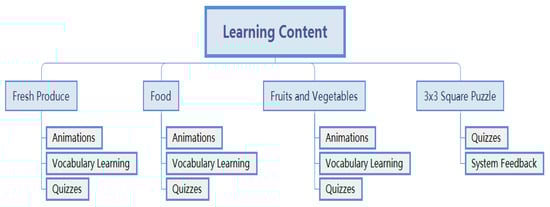 Based upon the design concept, the learning content was divided into the following four categories (see Figure 2). Each of the categories of fresh produce, food, and fruits and vegetables, had three parts, namely animations, vocabulary learning, and quizzes. A 3 × 3 square puzzle learning section consisted of two parts, namely quizzes and system feedback. We first explain the three parts for each of the categories as follows: