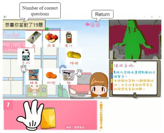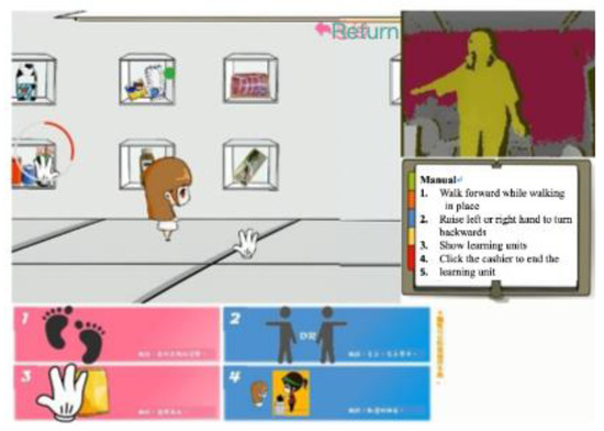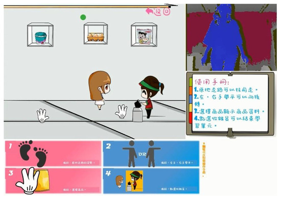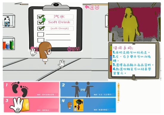 - Design of learning sections’ ending scenes: When learners reached the far-right corner of the system, an animated cashier appeared. Learners could enter the somatosensory quiz on grocery-related vocabulary (Figure 6) by touching the animated cashier.