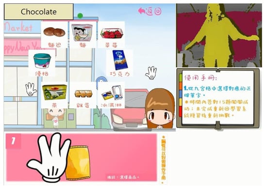 Game-based learning is currently one of the most popular topics within the digital learning field. Hung et al. [14] provided a scoping overview of empirical evidence on the use and impacts of digital games in language education from 2007 to 2016. In this research, a total of 50 selected studies were systematically analyzed, and two of the revealing findings are: most of the games for language learning were custom-built by the researchers; and personal computers were the most common platforms for playing games to support language learning. On the other hand, most research concerning somatosensory-based equipment developed learning materials in conjunction with game-based learning. For example, Vukicevic et al. [15] evaluated four Kinect-based visuo-motor games called Fruits that were specially designed for this research to test whether children with autism spectrum disorder (ASD) would show behavior changes during their gameplay. The study included 10 elementary school children with ASD, aged 9–13 years, who were divided into an experimental group (n = 5) who, in addition to standard treatment, played Fruits and a control group (n = 5) who received only standard treatment during this experimental period. The preliminary findings of the research indicated a motor skill benefit for children with ASD who play Kinect-based educational games. Erman and Zeynep [16] pointed out that foreign language education is promoted in Turkey, yet because of several factors, among which weekly hours of teaching and student motivation prevail, students still cannot develop their language skills. Therefore, they investigated the effects of game-based language learning with Kinect technology on students’ self-efficacy beliefs and attitudes toward English. They developed students’ communication skills by carrying out meaningful tasks based on real-life scenarios. The results revealed that there was a significant positive increase in some sub-factors of attitude and self-efficacy scores of the students.