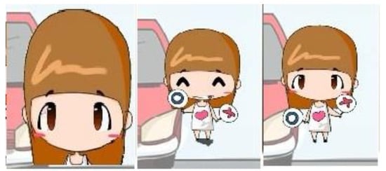 - Design of learners’ characters: Learners march in place and their animated character should move in a corresponding manner, as shown in Figure 3. When users wish to learn or review vocabulary, they could raise either left hand or right hand, and the animated character turned to face the corresponding direction.