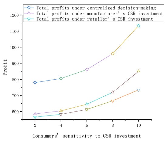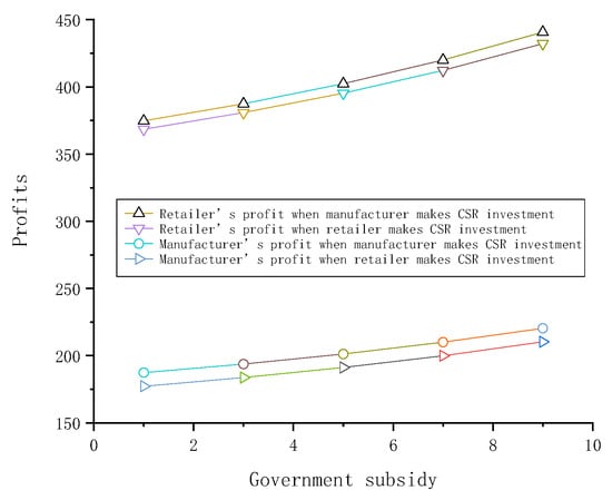 Property 4 shows that in the CLSC considering government subsidy and CSR investment, whether the manufacturer or the retailer makes CSR investment, as the consumers become more sensitive to CSR investment, the wholesale and retail price, market demand, the recovery rate of used product, and CSR investment level will all increase. Meanwhile, the profits of CLSC members and whole system will also increase. This is because whether the manufacturer or retailer makes CSR investment, it will actively increase their CSR investment levels in order to better attract consumers. Since the cost of CSR investment has increased, the manufacturer or retailer will make up for their losses in CSR investment by increasing wholesale or retail prices. However, the rise in wholesale and retail price will not significantly affect consumers’ purchase needs, and consumers are also more willing to pay for companies that actively undertake CSR (in fact, without considering government subsidy mechanisms, Panda et al. [30] also show that consumers are willing to pay higher prices for products with CSR attributes). At the same time, the increase in market demand for new products and the recovery rate of used products will also increase the profits of CLSC members and whole system.