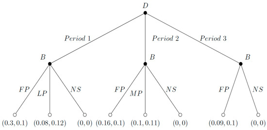 The first mover problem for a site that has been recently remediated is modeled in the game tree below (Figure 2) with two stages. Focusing on the resale of the property, the game tree has two players: the Developer (D) who owns the recently remediated property and the Buyer (B) of the remediated property. The Developer goes first, and the Buyer responds in Stage 2 of the game. The Developer is modeled as having three choices: sell the property immediately after cleanup (Period 1), sell the property in Period 2 (a five-year hold), or sell the property in Period 3 (a ten-year hold). Payoffs for the Developer are generated by calculating the Net Present Value (NPV) of all cash flows and costs (R) to the property over time:
