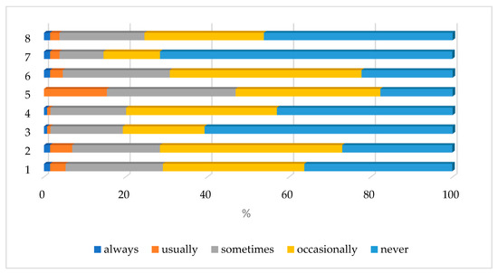 | Frequency | Checking the Stock of Food Products before Shopping | Preparing a List of Products Needed | Buying Food Products that Have not been Planned | Shopping to Stock Up on Food | Buying Products with a Short Expiry Date |