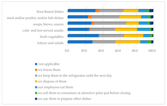 | Frequency | Semi-Finished Products, | Cold-Served Dishes | Warm Served Dishes | Bread | Wilted Fruits and Vegetables | Expired Products | Partly Consumed Products with Signs of Spoilage | Partly Consumed Products without Visible Signs of Spoilage |