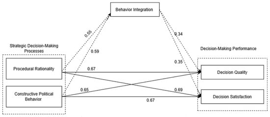 Furthermore, it can be seen from Model 5 in Table 3 that procedural rationality and behavioral integration have a significant positive correlation (beta = 0.553, p < 0.001); behavior integration and strategic decision satisfaction in Model 8 have a significant positive relationship (beta = 0.353, p < 0.05); meanwhile, procedural rationality and strategic decision satisfaction also have a significant positive correlation (beta = 0.492, p < 0.001). This explains that behavior integration partially mediates between procedural rationality and decision satisfaction. Thus, H2b holds. By Model 6 in Table 3, constructive political behavior and behavior integration have a significant positive correlation (beta = 0.588, p < 0.001); behavior integration and strategic decision satisfaction by model 10 have significant positive correlation (beta = 0.302, p < 0.01); meanwhile, constructive political behavior and strategic decision satisfaction also have a significant positive correlation (beta = 0.493, p < 0.001), thus indicating that behavior integration partially mediates between constructive political behavior and decision satisfaction; hence, H2d was established. The results for the SEM model are presented in Figure 2.