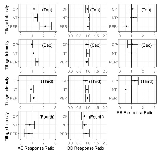 Pooled response ratio of tillage intensity [chisel plow (CP), no-till (NT) and perennial system (PER)] relative to moldboard plow and the 95% confidence intervals (horizontal bars) determined by network meta-analysis for soil aggregate stability (AS), bulk density (BD) and penetration resistance (PR) within four soil depths (Top ≤ 15-cm; Second > 15 to ≤ 25-cm; Third > 25 to ≤ 40-cm; and Fourth ≥ 40-cm).