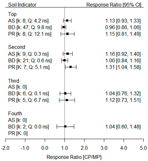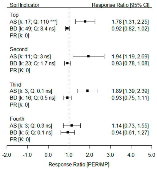 Response ratio [perennial system (PER)/moldboard plow (MP)] and the associated 95% confidence intervals (horizontal bars) for soil aggregate stability (AS), bulk density (BD) and penetration resistance (PR) within four soil depths (Top ≤ 15-cm; Second > 15 to ≤ 25-cm; Third > 25 to ≤ 40-cm; and Fourth ≥ 40-cm). Where k is the number of pairwise comparisons; Q is the heterogeneity followed by its significance (*** significant at 0.1%, * significant at 5% and ns, not significant) considering a random effect model without moderators.