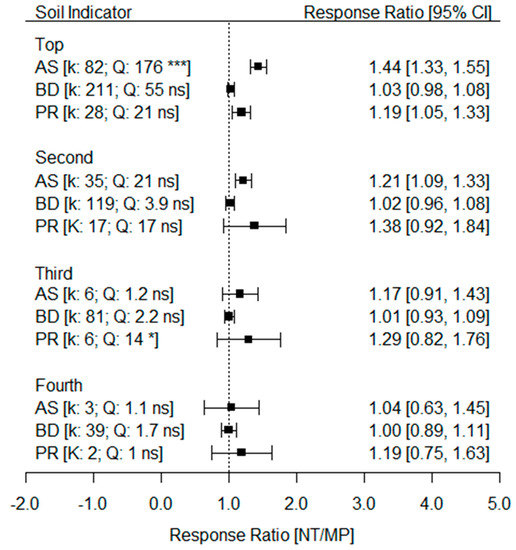 Response ratio [no-till (NT)/moldboard plow (MP)] and the associated 95% confidence intervals (horizontal bars) for soil aggregate stability (AS), bulk density (BD) and penetration resistance (PR) within four soil depths (Top ≤ 15-cm; Second > 15 to ≤ 25-cm; Third > 25 to ≤ 40-cm; and Fourth ≥ 40-cm). Where k is the number of pairwise comparisons; Q is the heterogeneity followed by its significance (*** significant at 0.1%, * significant at 5% and ns, not significant) considering a random effect model without moderators.