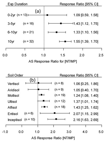 Between NT and MP, there was significant heterogeneity in the model without moderators for topsoil AS and for PR within the third soil depth. Factors that moderated topsoil AS response to NT in relation to MP were study duration and soil order. Figure 6a shows the duration effect and suggests that more than two years are necessary for NT to increase AS relative to MP. Figure 6b shows soil order effects on topsoil AS response ratio for NT relative to MP. Generally, Inceptisols, Entisols, Alfisols, Ultisols and Mollisols showed the greatest NT effects. Heterogeneity decreased from 176 (without moderators) to 98 with the inclusion of the significant moderators in the model but this value was still significant (p-value = 0.035) indicating topsoil AS response to NT when compared to MP can be affected by other factors not considered in this study. Significant heterogeneity was also observed for PR within the third soil depth for NT vs. MP comparisons and for topsoil AS for PER vs. MP comparisons. We did not test for moderator’s significance due to the low number of observations, although (we have considered at least 10 observations for each moderator).